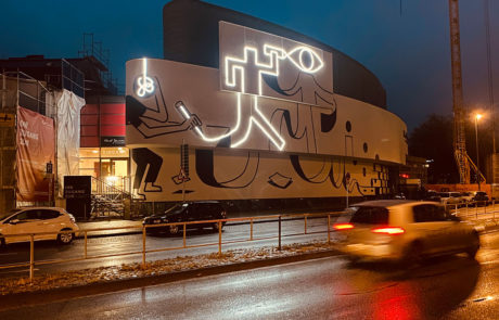 Die Fassade erzählt eine Geschichte – von nächtlicher Kreativität, von Energie, Bewegung und von dem leuchtenden Moment, wenn Gedanken Form annehmen.